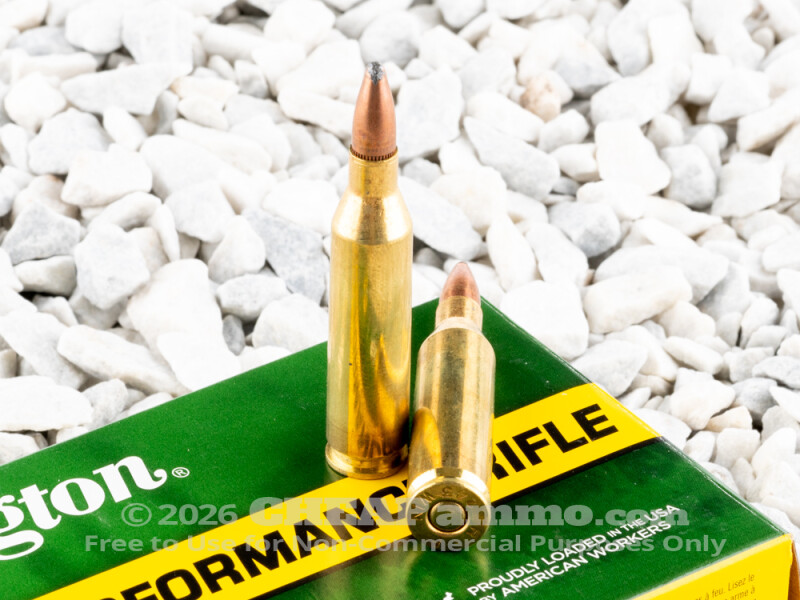 The 80 grain soft point bullet by Remington has a muzzle velocity of 3350 feet per second with approximately 1900 foot pounds of energy behind it. This is ideal for use in hunting anything up to coyotes and the like as well as precise hits on game such as deer.