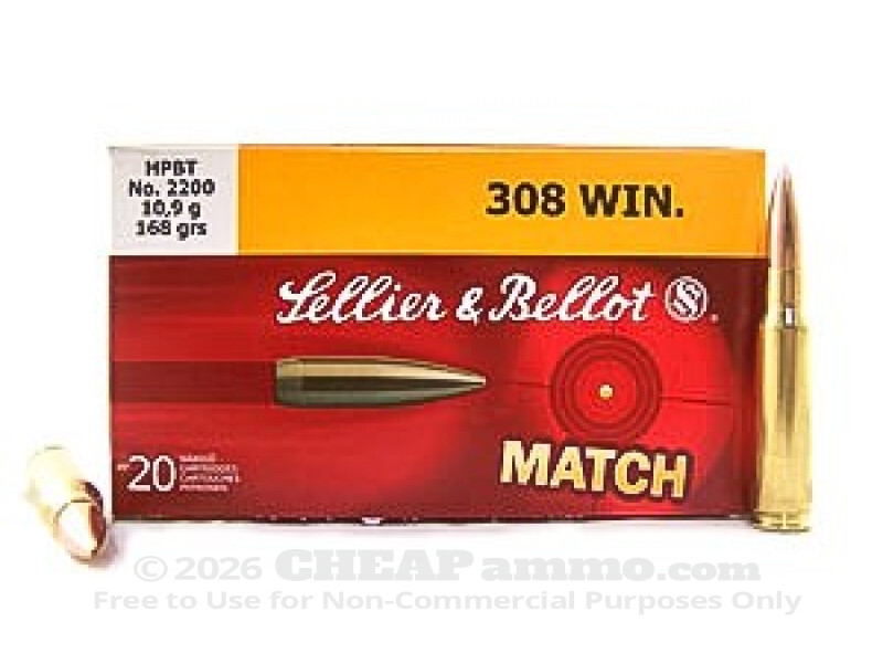 Sellier & Bellot - Hollow Point Boat Tail - 168 Grain 308 Winchester Ammo - 20 Rounds
