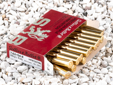 The 7.62x54R was developed in 1891 for the Russian military and has been in continual service ever since: the longest serving military cartridge to date. Known colloquially as the 7.62 Russian, the “R” in the designation in fact stands for rimmed: this is also the only serving rimmed round in modern military service. Originally intended for the 1891 Mosin Nagant rifles as well as its successors and variants, it is still used in modern Russian squad automatic weapons (SAWs) and sniper rifles popular in all nations that utilize Warsaw Pact style weapons. The 174 grain hollow point, boat tail bullet by Sellier & Bellot has a muzzle velocity of 2615 feet per second with 2643 foot pounds of energy. This round is produced for range training and competitive match shooting in your surplus Eastern Bloc rifles.