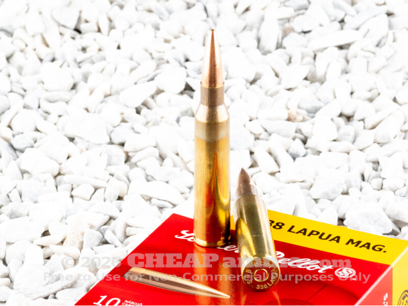 The U.S. military developed .338 Lapua ammunition in the 1980s when it needed something in between the standard sniper round, the .300 Winchester Magnum, and the .50 BMG which was more suitable for anti-vehicle than anti-personnel. It was initially developed from a necked down .416 Rigby sporting cartridge, strengthened and loaded with modern powder. While developed for the military and their purposes, the cartridge has been adopted by many civilian shooters for long range target shooting as well as safari hunting. The result is a growing number of commercial firearms chambered in this caliber. The 250 grain hollow point, boat tail bullet by S&B has a muzzle velocity of 2878 ft per sec with 4599 ft lbs of energy. It is a premium hunting round. This is a round developed for long range target work but also designed to be effective against large and potentially dangerous game.
