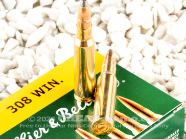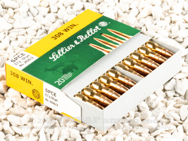 The round that became the .308 Winchester began development after World War I when the US military had concerns about developing semi and full automatic weapons in the standard .30-06 Springfield due to the long case. Browning and Garand attended to that concern nullifying a need for a new round, but after Korea, as the US became more and more involved with NATO coalition forces, a caliber change became necessary. In the meantime, Winchester continued with their development of a shorter .30, released in the early 1950's in the form of the .308. The 7.62x51 NATO round, adopted 2 years later is physically identical, and firearms in either chamber may safely fire the other round. Sellier & Bellot's 150 grain soft point cutting edge (SPCE) bullet has a muzzle velocity of 2756 feet per second with 2530 foot pounds of energy. This bullet is designed to open up after impact in a consistently reliable manner for guaranteed energy transferal into the target and is ideal as a hunting caliber.