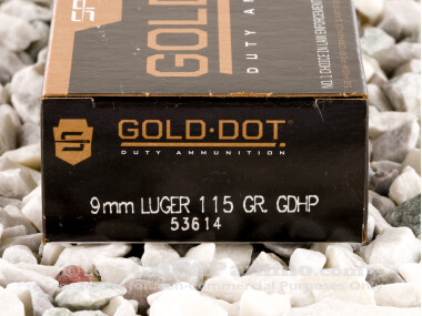 This round is loaded with a 115 grain Gold Dot jacketed hollow point bullet. It features an abnormally tough lead core, an electrochemically bonded copper jacket, and a carefully constructed nose cavity. These features come together to give the Gold Dot outstanding durability, accuracy and reliability. It penetrates to an ideal depth for neutralizing a threat, and expands to nearly double its diameter following impact with ballistic gelatin at 10 feet.