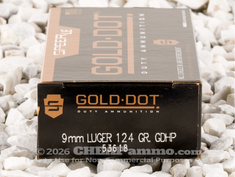 The Gold Dot is the first commercially available handgun bullet with a true bonded core. Speer creates the bullet by submerging alloyed lead in an electrochemical bath, thus fusing the core to its copper-alloy jacket. The result is a durable bullet which exhibits superior weight retention – the key to effectively deep penetration. According to Speer’s own terminal ballistics testing, this round’s 124 grain bullet will only lose 0.1 grains of its weight after striking bare ballistic gel. If the gel is shielded by heavy fabric, weight loss increases to a mere 0.3 grains.
