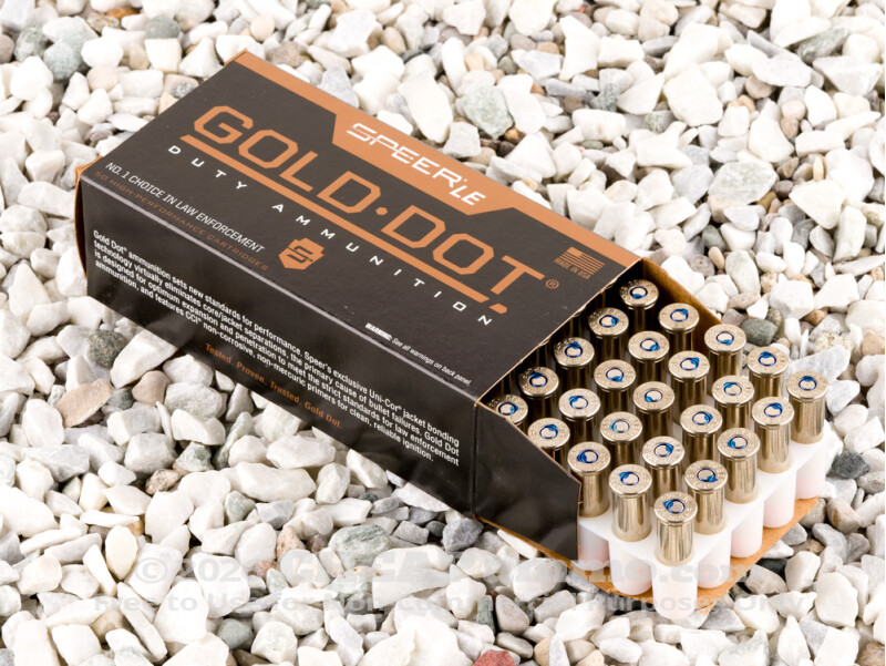 This round’s 125 grain projectile is no ordinary jacketed hollow point. It is the Gold Dot: a JHP with a fully bonded jacket and precision-formed nose cavity, which is why it penetrates barriers so effectively and proceeds to unleash rapid yet uniform terminal expansion. If you were to fire the bullet out of a 4” vented barrel into a block of ballistic gel (which has approximately the same density as a swine’s muscle tissue) that is covered by four layers of fabric (T-shirt, cotton shirt, fleece and denim) from a distance of 10’, the bullet would penetrate to a depth of around 11” and expand to a diameter of about 0.58”.