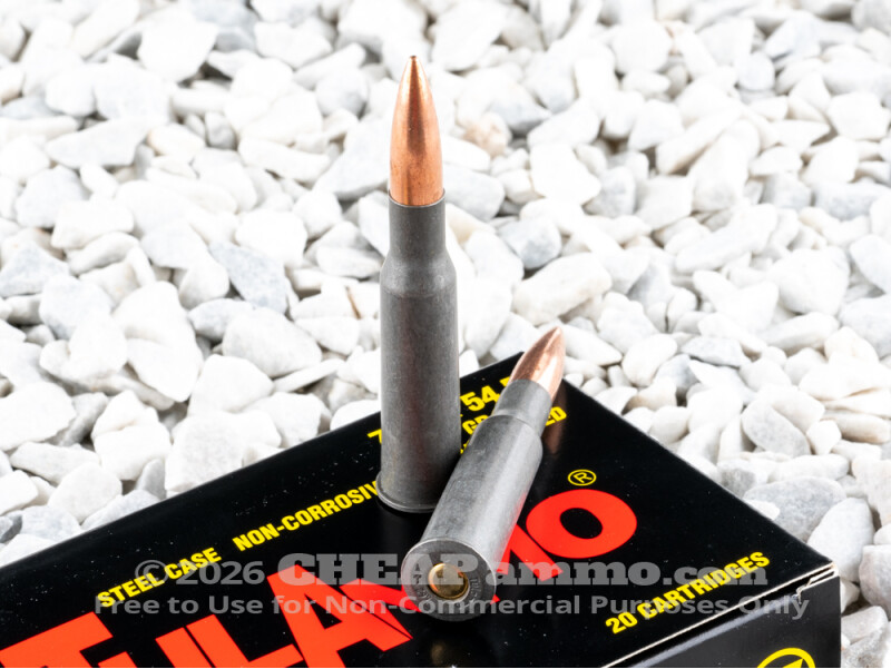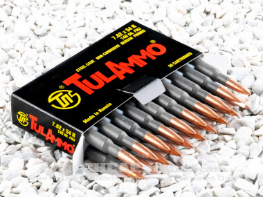 This 7.62x54r cartridge is perfect for any Mosin-Nagant, AVS-36, Winchester Model 1895, Alejandro sniper rifle, Dragunov SVU, or Berkut-2M1 capable of chambering it. The key feature of a Tula round is its casing, which is made of steel rather than conventional brass. It’s far more economical for not containing any rare copper, and the primary tradeoff for that perk is that it’s not reloadable. This round’s primer is a non-corrosive Berdan, which means the casing has two flash holes and is even less suitable for reloading because of them.