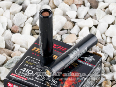 This shell’s 750 fps muzzle velocity may seem unusually low, but that is only because Winchester recorded it with a revolver-length barrel. (A shotgun will produce a significantly higher muzzle velocity.) This ammo’s hulls feature sensitive primers, black oxide high-base heads, and tapered rims that promote reliable functionality in all brands and styles of 410 Bore firearms.