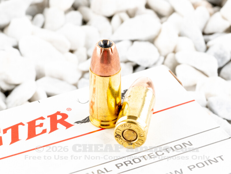 These affordable 9mm rounds are a dependable choice for both concealed carry and home defense. Winchester manufactures these rounds using clean-igniting Boxer primers, reloadable brass casings, and proven propellant blends. Each cartridge fires a 115-grain, copper-jacketed projectile with a slim hollow cavity.