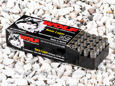 This is Wolf ammunition! Not the kind you would use to shoot a wolf, though. We advise a rifle for that pastime, although we suppose if a wolf tried to mug you in a back alley you’d be better off with a mag full of 9mm range rounds than nothing at all.